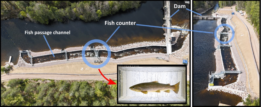 Bilden nedan är ett exemple på hur fiskräknare (”fish counter”) kan användas för att registrera uppvandrande fisk i en fiskväg förbi en dam som skapar ett vandringshinder. Fiskräknaren kan då ge möjlighet att följa upp fiskvägens funktion och antalet vandringsfiskar som tar sig förbi vandringshindret.