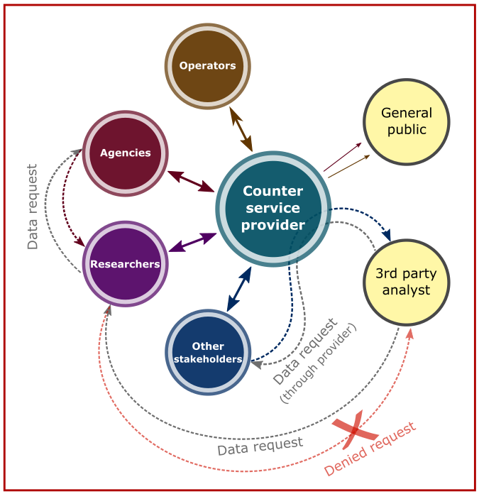I dagsläget finns det ett antal aktörer i Sverige som har installerat fiskräknare i fiskvägar vid vandringshinder. Det inkluderar vattenkraftsägare, myndigheter, forskare och andra intressenter. Dessa aktörer har oftast ett löpande samarbete med bolaget som tillhandahåller fiskräknarna. Det finns dock ingen aktör som sammanställer, kvalitetsgranskar och tillhandahåller den information som samlas in. Dessa data är därför i dagsläget utspridda, ojämnt kvalitetsgranskade och ofta svåråtkomliga vilket bilden nedan illustrerar.