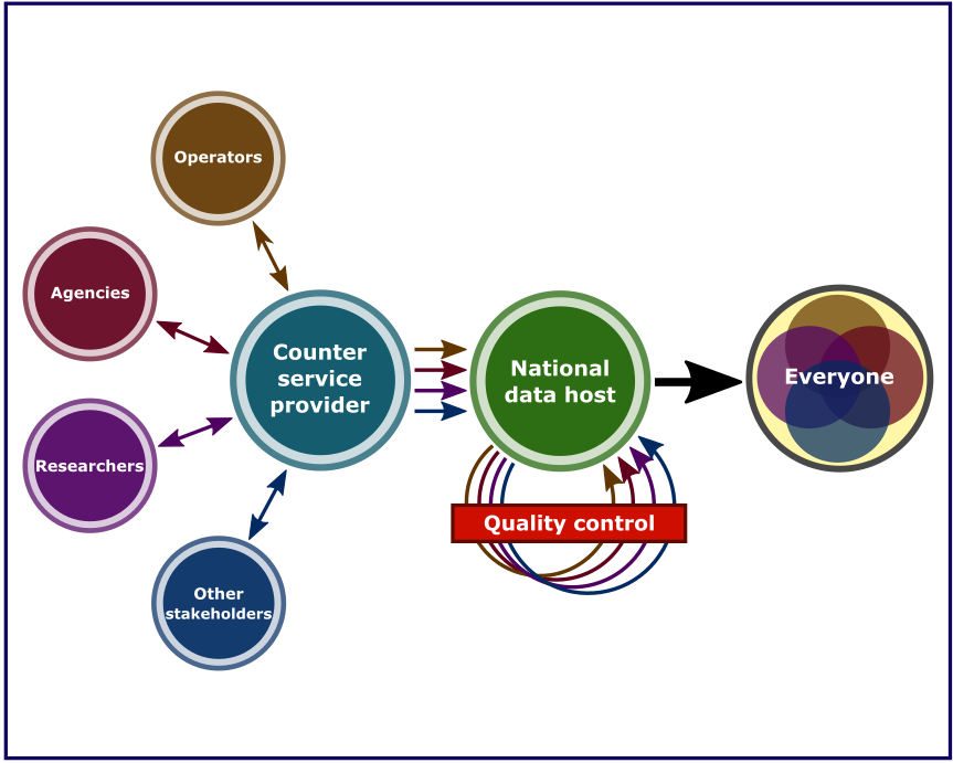 FISH STEWARDS är ett innovativt projekt som avser frigöra potentialen i fiskräknardata genom att skapa en nationell, öppet tillgänglig databas med standardiserad fiskräknardata. Vår ambition är att arbetet tar oss närmare skapandet av en nationell databas med tillhörande datavärd som tillhandahåller kvalitetsgranskad data om fiskvandring från fiskräknare till alla intresserade aktörer på det sätt som bilden nedan visar.
